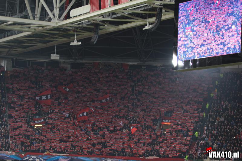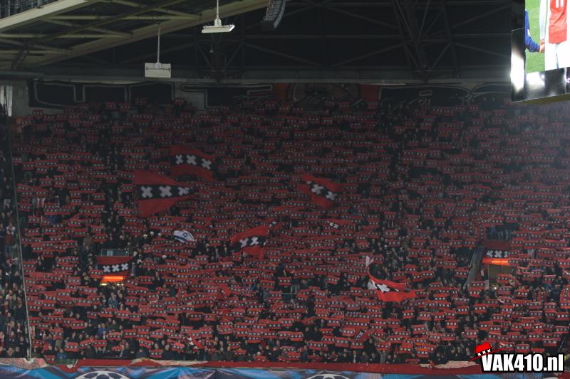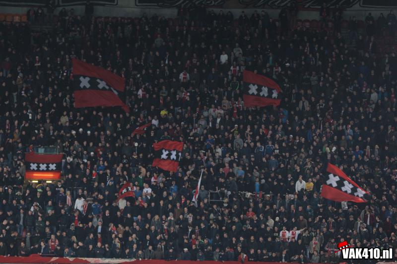 Op het vak vindt een ieder een Amsterdams doekje op zijn stoel. Weken lang werd er door diverse jongens voorbereid en gebouwd aan 1600 Amsterdamse vlaggen. Na diverse songs, die meteen goed hard gaan , betreden de spelers het veld voor de wedstrijd. Het gehele vak wordt volledig gekleurd door de Amsterdamse doeken en megavlaggen wat zorgt voor een fantastisch gezicht.