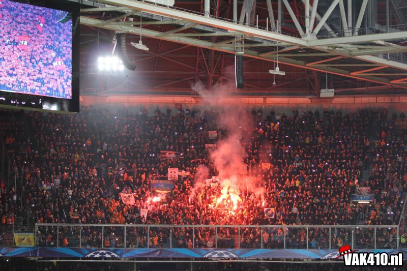 We beginnen kwa sfeer goed. ‘Geen dag’ start keihard en vervolgens zitten er ook diverse uitschieters tussen. Later zakt het wat in, mede misschien ook doordat het op veld nog niet echt lukt. Vlak voor rust is het toch raak. De tweede helft knalt het vak dan ook nog harder, wetende dat Ajax met deze steun de voorsprong nog verder kan uitbouwen. En dat gebeurd. Met uitstekend voetbal is de stand na zo’n 50 minuten spelen 3-0 en barst er een massaal feest los. Diverse songs galmen door de Arena en na de 4-0 gaat het volume alleen maar verder omhoog tot het einde van de wedstrijd.