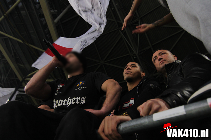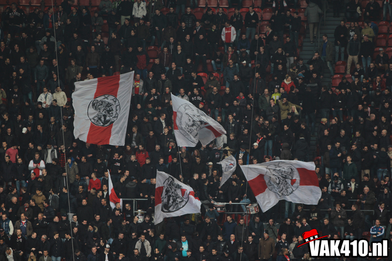 Zodra het metershoge doek naar beneden gaat is het tijd voor chaos. De lijn die is ingezet met AZ thuis kent vandaag zijn vervolg. Opnieuw staan er jongens bij 424 en wordt er 90 minuten lang gevlagd. De sfeer is uitstekend, diverse keren gaat een song goed hard. Ook op het veld gaat het goed. In tegenstelling tot afgelopen weken waar het moeizaam ging en soms met wat gelukt, knokt Ajax zich vandaag terug na een achterstand.