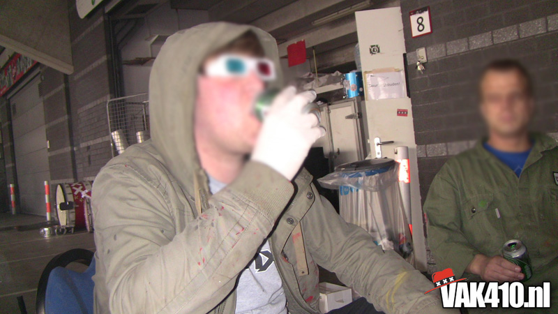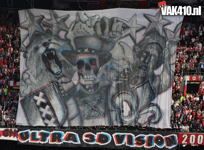 Op 410 stond vandaag een wereld primeur op het menu: ULTRA 3D VISION. Voordat het doek werd gehesen werden op het vak honderden zwarte zonnebrillen ingeruild voor 3d brilletjes. De wereld waarin wij leven is nou eenmaal driedimensionaal. Op het doek kwamen de leeuw, Ajax en 410 tot leven. Nee, ze kwamen eruit.