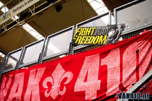 Ook hebben we het 410 logo op een vlag laten drukken. Zoals je van ons gewend bent maken wij onze vlaggen altijd zelf. Alleen is niet iedereen gecharmeerd van een verflucht in zijn kamer of in zijn reistas als je onderweg bent naar een Spaanse costa. Daarom hebben wij het logo op een lekkere wit-rood-witte achtergrond laten drukken, eenmalig. Bedoeld voor andere plekken dan in het stadion, want dan laat je je eigen doeken zien. De vlaggen (op=op) kosten 10 euro en zijn zondag verkrijgbaar bij het merchandise verkooppunt nabij vak 424.