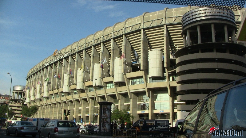 Nadat we met een leuke groep bekenden van 410 de metro naar Santiago Bernabéu namen was het al aardig druk bij het stadion. Van buiten lijkt het niet zo hoog, maar eenmaal in het uitvak (5e en 6e ring!) ben je toch wel even onder de indruk. Die indruk was echter van korte duur aangezien de warming up in volle gang was en de sfeer in het uitvak opperbest.