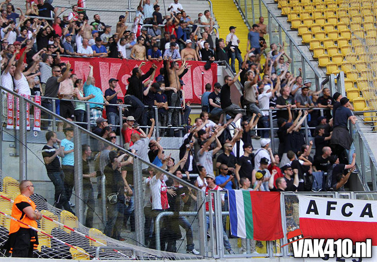In de 14e minuut was er een kleine wit-rood-witte rookshow. Met veel gefluit van de thuisaanhang op deze actie en enkele rookpotten op het gras, was de toon gezet. Wij allen kennen ook de vocale steun van Dynamo. Op enkele hele harde momenten van DY-NA-MO en massale handclaps na was de sfeer niet zo goed. Voor en tijdens de match werden enkele Ajacieden uit de groep gehaald. Op het vak werd de bestorming van de politie die enkele van ons er uit pakte, niet gewaardeerd door ons. Na de 0-3 en het incident met het oppakken van onze jongens werden we nog een uur vastgehouden bij onze bussen. Enkele stenen werden over een heg gegooid waarop enkele arrestaties volgde. telefonisch werd er gemeld dat wij 5 minuten nadat we met de bussen zouden vetrekken nog wat konden verwachten. We wachten nu nog in spanning af op het grote Dynamo?! Wellicht was voor vele van hun de zomerstop belangrijker dan dat een grote club als Ajax op bezoek komt.